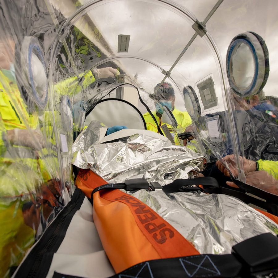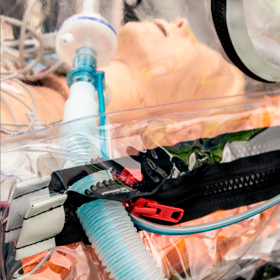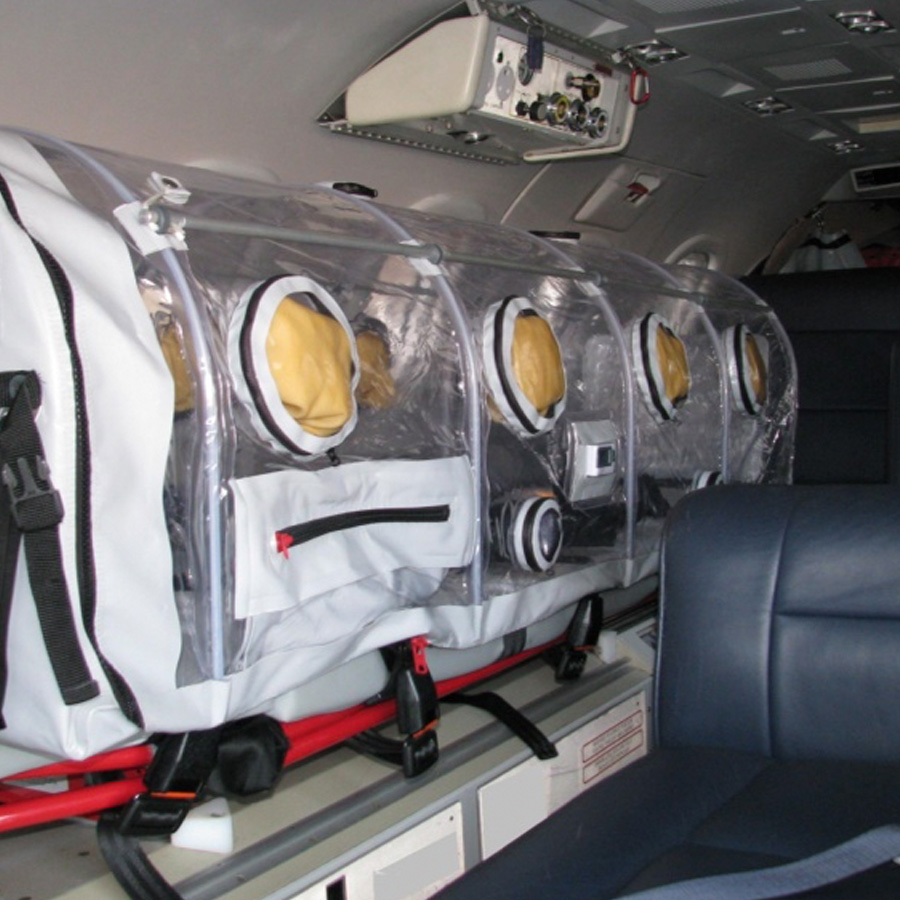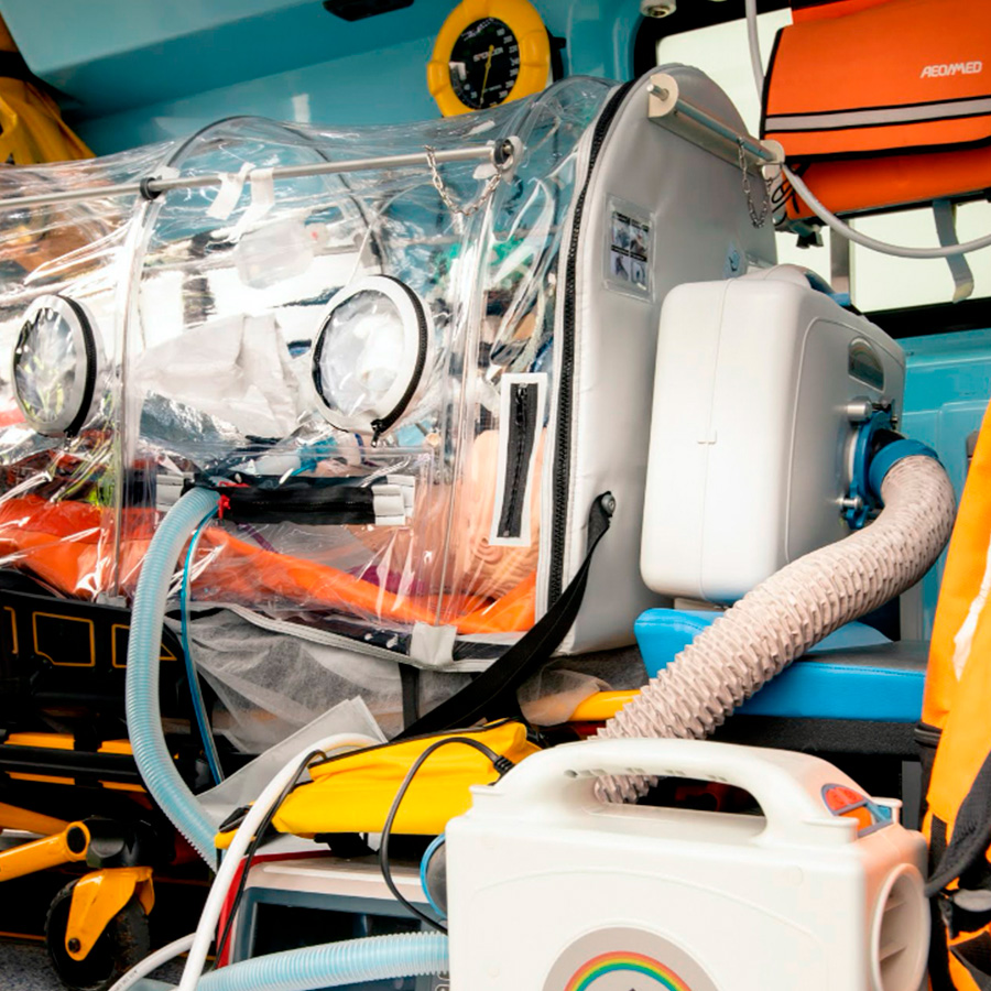 Il s'agit d'un dispositif de transport de patients en confinement biologique élevé, aux dimensions similaires à celles d'un brancard. Il est doté d'un espace de chevauchement pour créer une zone de confinement et une atmosphère garantissant la protection des opérateurs et des autres personnes contre l'exposition à des agents potentiellement infectieux.