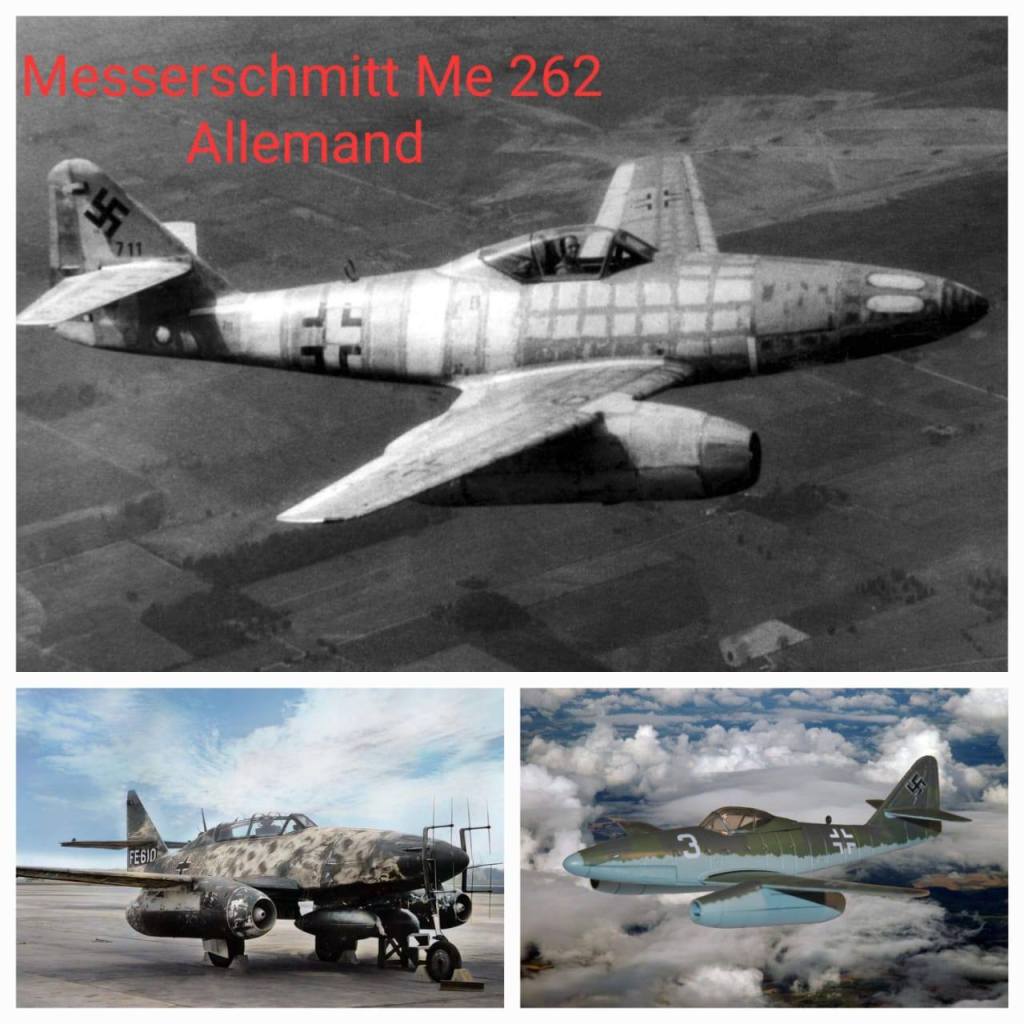 Note: Le « Messerschmitt Me 262 » Allemand est le premier avion à réaction au monde, on avait une version de combat et une version chasseur-bombardier. Son premier vol inaugural était en juillet 1942 et il a été mis en service en avril 1944 pendant la guerre.