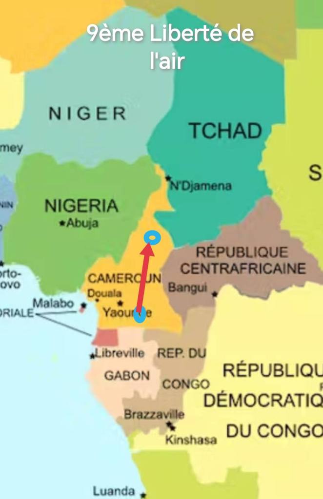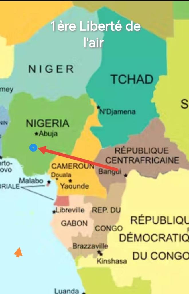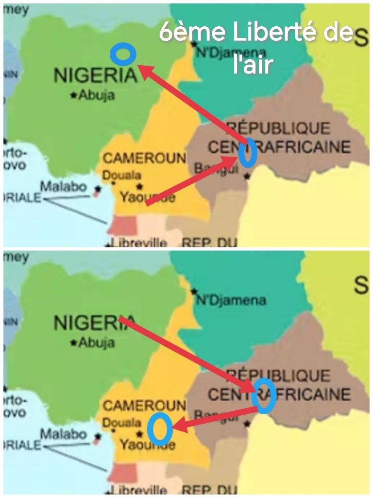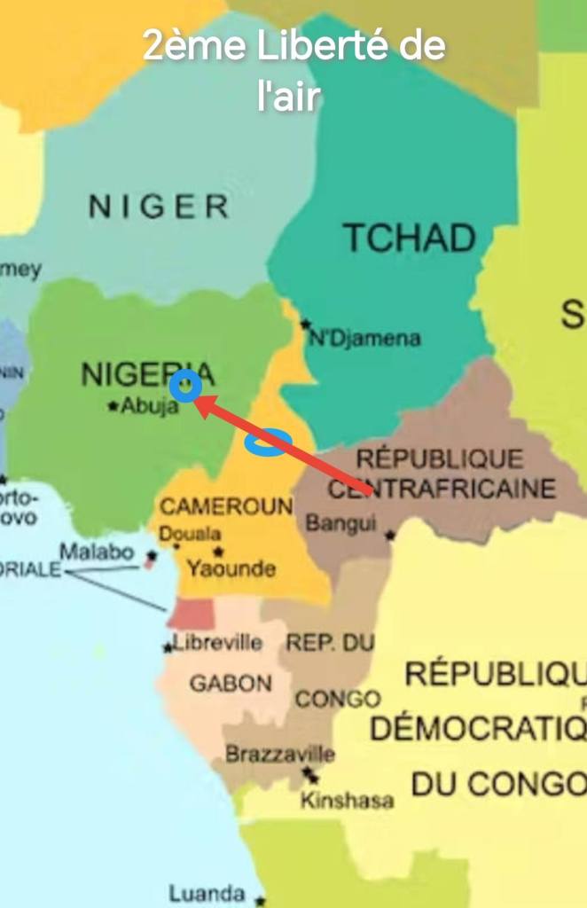 Exemple : Karinou Airlines (compagnie aérienne Centrafricaine) survole le Cameroun pour effectuer un vol Bangui-Abuja entre la République Centrafricaine et le Nigéria.